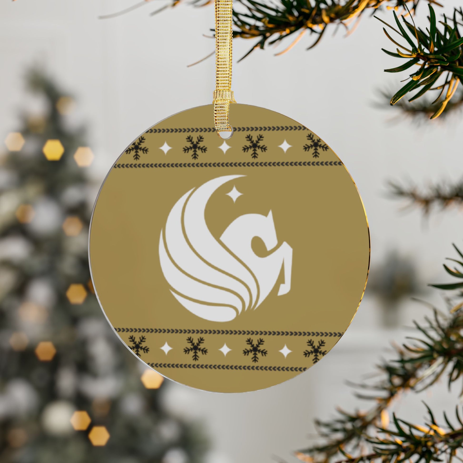 The Pegasus Ugly Sweater ornament captures UCF’s bold heritage with a festive twist. This sleek acrylic ornament features the iconic Pegasus logo wrapped in a cozy holiday design — a golden highlight for any Knight’s Christmas tree.